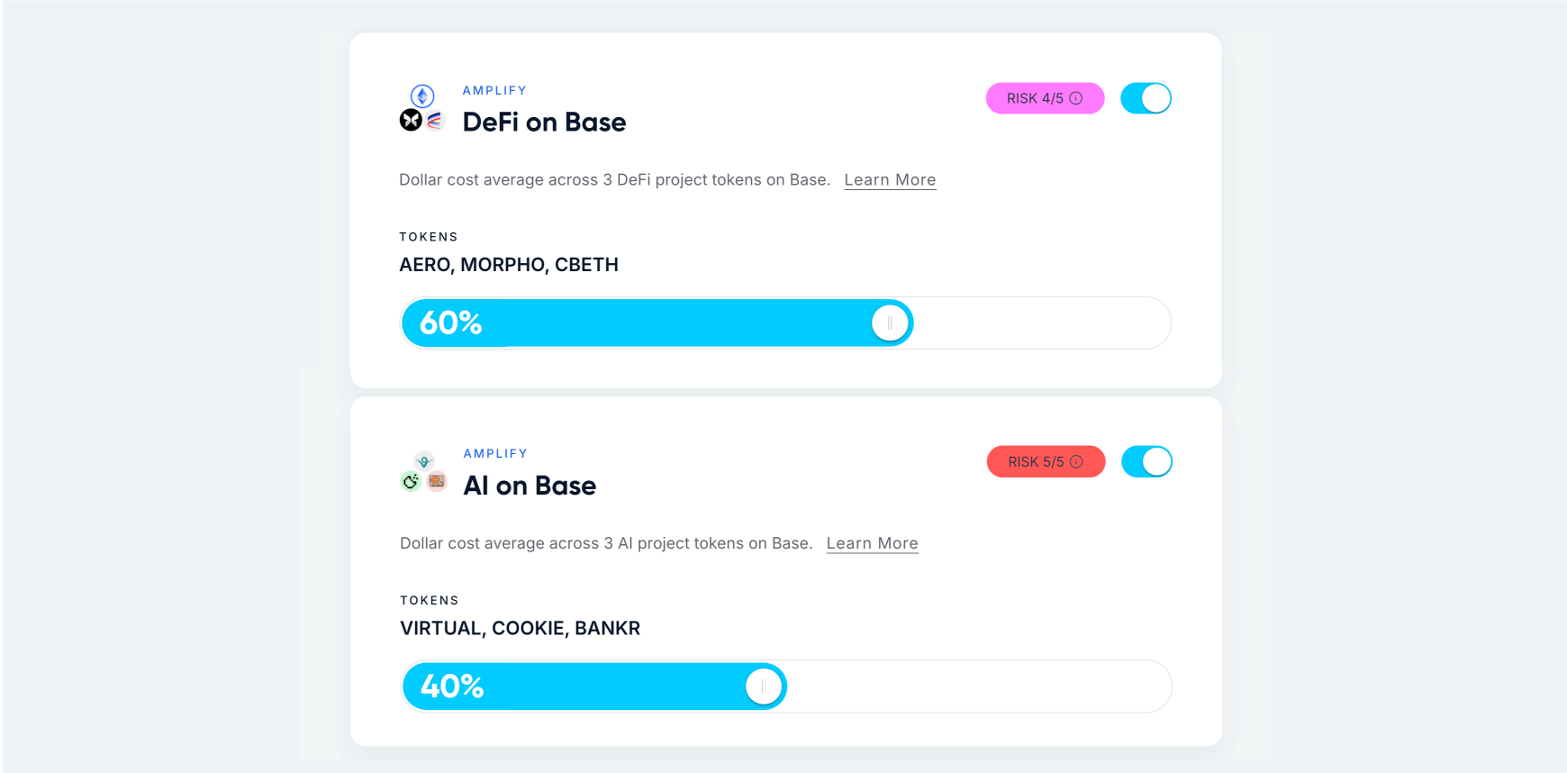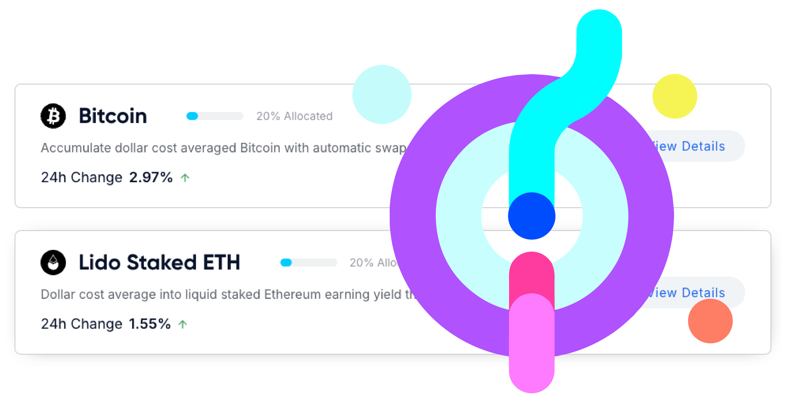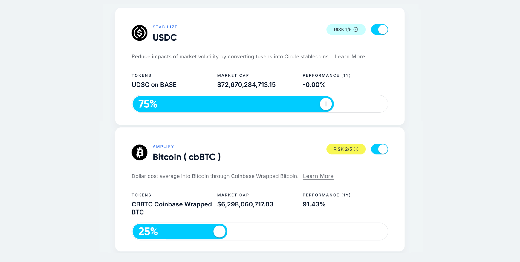 your onchain earnings with a simple custom portfolio. Deposit transactions are one-to-many swaps into your portfolio assets.